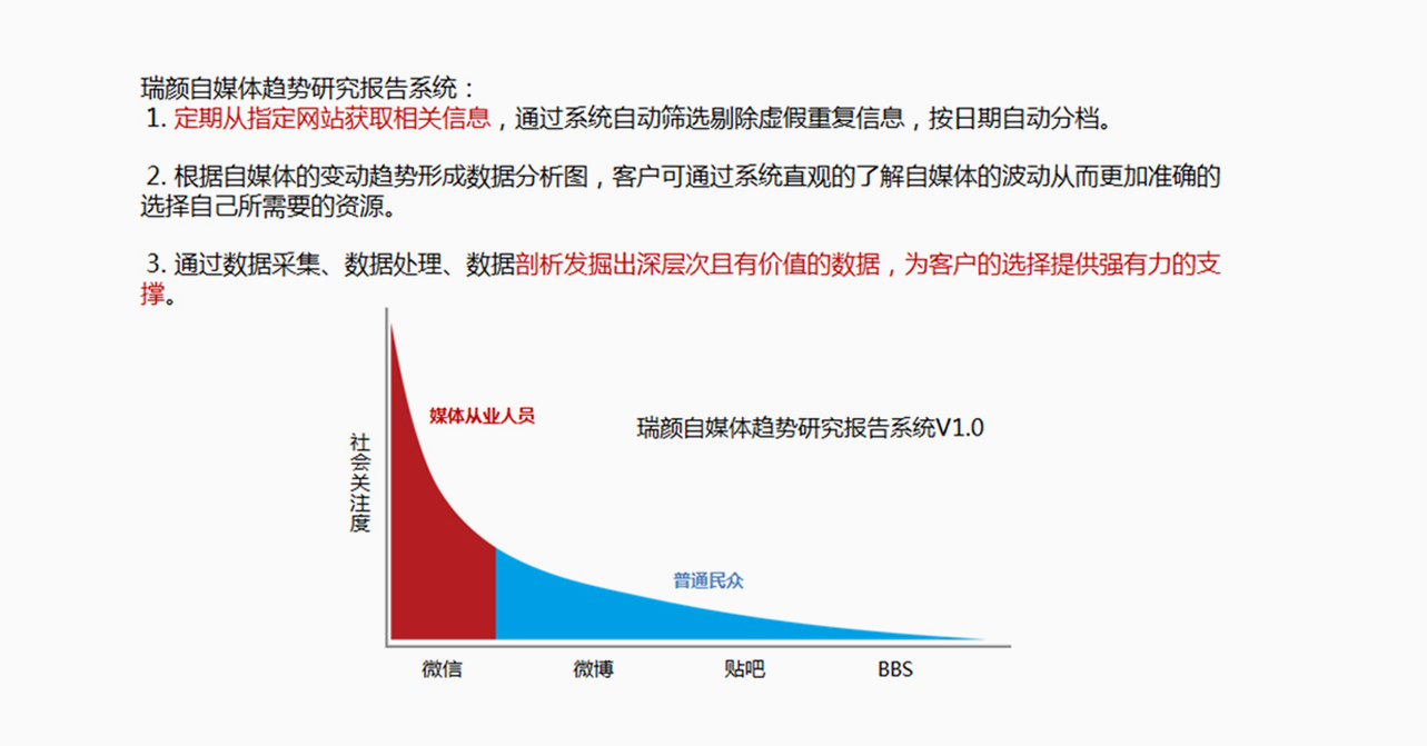 瑞顏建立項(xiàng)目資源的統(tǒng)一管理,成就行業(yè)第一個通過平臺整合資源并自動配對服務(wù),給整個行業(yè)帶來了一道新的標(biāo)桿。瑞顏大數(shù)據(jù)開發(fā)部通過數(shù)據(jù)聚合、內(nèi)容聚合平臺、自媒體管理平臺、用戶交互數(shù)據(jù)平臺,建立一套內(nèi)容數(shù)據(jù)、用戶數(shù)據(jù)與媒體數(shù)據(jù)交互的組合平臺,實(shí)現(xiàn)互聯(lián)網(wǎng)各內(nèi)容的挖掘聚合、媒體內(nèi)容的全新交互展現(xiàn)。